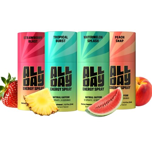 ALLDAY Caffeine Spray, Promotes Focus and Energy (Variety Pack, 4 Bottles, 48 Sprays) | 32mg Natural Caffeine per Spray | Pocket-Size Energy Shot with L-Theanine, Vitamin B12, & Vitamin D