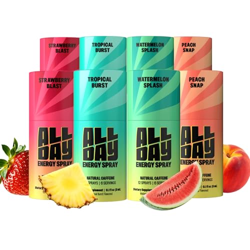 ALLDAY Caffeine Spray, Promotes Focus and Energy (Variety Pack, 8 Bottles, 96 Sprays) | 32mg Natural Caffeine per Spray | Pocket-Size Energy Shot with L-Theanine, Vitamin B12, & Vitamin D